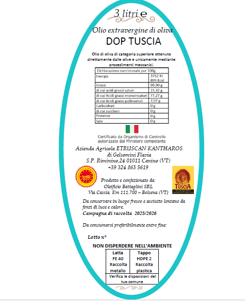 La nostra produzione olivicola viene lavorata in frantoio nelle 12 ore dalla raccolta. Il processo di spremitura scelto per ottenere il nostro olio evo Dop Tuscia è l’estrazione a freddo, ovvero la temperatura di lavorazione delle olive non supera i 27 °C.