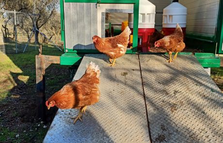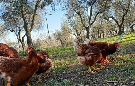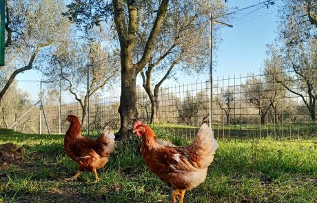 Le galline sono libere di razzolare all’aria aperta sotto meravigliosi alberi di olivo.
